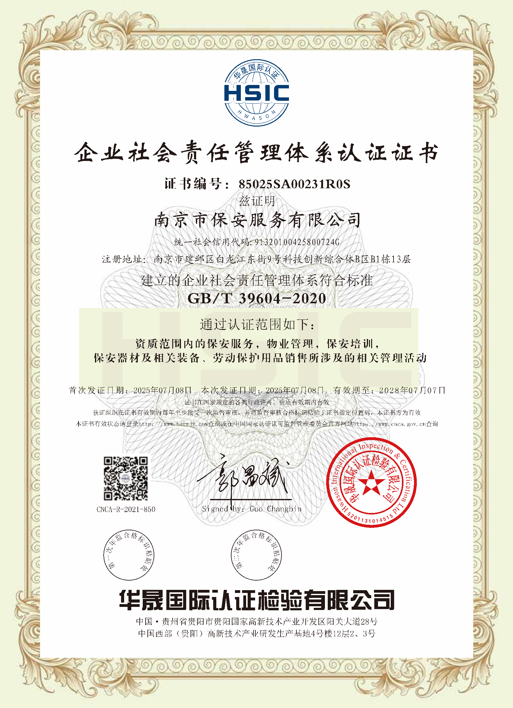 Established in April 1987, Nanjing Security Service Co., Ltd. is a large state-owned security enterprise with a long history of security operation and rich security experience. Now it is a managing director of both? China Security Association and Jiangsu?Security Association, vice president of? Nanjing Security Association, one of the top class security service companies in Jiangsu Province.